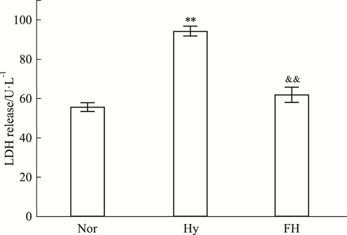 LDH是公认的细胞损伤标志物。与Nor组相比,Hy组培养基中LDH含量明显升高(P<0.01),表明缺氧导致PC12细胞膜损伤,细胞内的LDH外泄到细胞培养液中。而与Hy组比,经盐酸氟西汀处理后,LDH水平降低(P<0.01),说明盐酸氟西汀能够维持细胞膜的完整性,减轻缺氧对PC12细胞的损伤,见Fig 3。