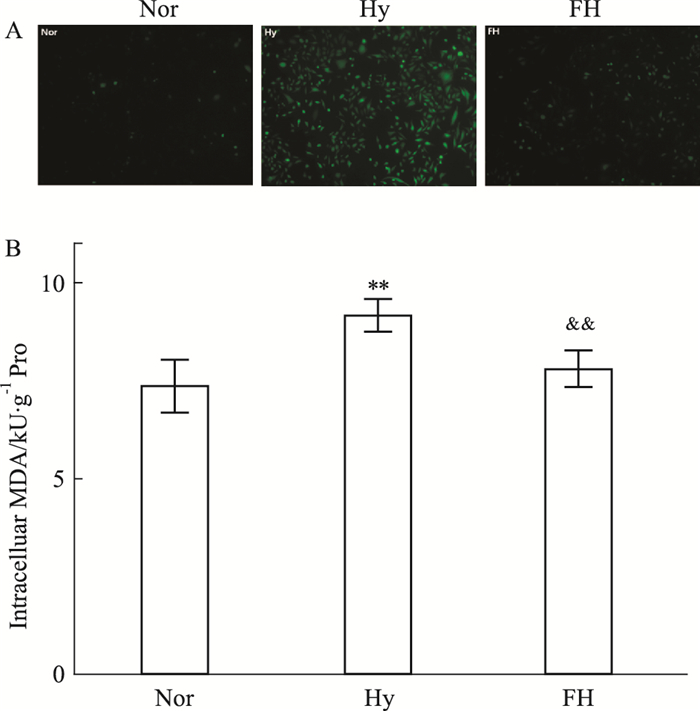 活性氧(reactive oxygen species,ROS)和丙二醛(Malondialdehyde,MDA)是最主要的氧化损伤指标。如Fig 4A所示,ROS染色后发绿色荧光,与Nor组相比,Hy组胞内ROS含量明显增高,而FH组的ROS表达量没有明显增加,低于Hy, 而与Nor组差异无统计学意义。MDA含量的变化与ROS相同, 如图Fig 4B。以上结果说明氟西汀可以有效缓解缺氧导致的胞内氧化损伤。