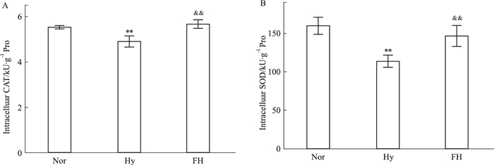 与Nor组相比,Hy组的CAT活性显著降低(P<0.01),但FH组并没降低,且显著高于Hy组(P<0.01),而与Nor组处于同一水平(Fig 5A)。SOD活性的变化与CAT相似(Fig 5B),表明盐酸氟西汀能够抵御缺氧造成的氧化损伤,显著提高抗氧化酶活性。