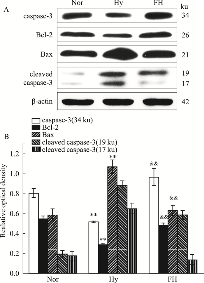 与Nor组比较,Hy组中促凋亡蛋白Bax的表达量增加(P<0.01),而抗凋亡蛋白Bcl-2和caspase-3下降。FH组与Hy组相比,促凋亡蛋白表达量下降而抗凋亡蛋白表达量上升(P<0.01), 表明盐酸氟西汀抑制缺氧导致的细胞凋亡(Fig 6)。