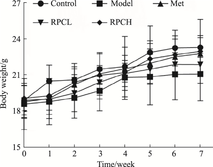 3 结果 3.1 RPC对糖尿病小鼠一般情况的影响Con组小鼠毛色正常,精力旺盛,反应快,无多饮多食多尿现象;Mod组小鼠毛色灰暗,精神萎靡、反应慢,有明显的多饮多食多尿;RPC组及Met组小鼠经治疗后,毛色恢复光泽,多饮多食多尿有所改善,精神状态及反应灵敏度均优于Mod组。