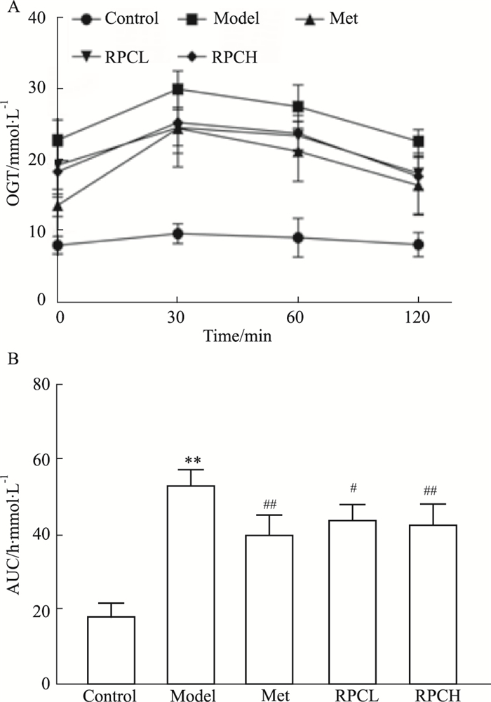 | Fig 2 Effect of RPC on OGTT in diabetic mice (x±s, n=6) A: OGTT; B: AUC of OGTT. **P < 0.01 vs Con group; #P < 0.05, ##P < 0.01 vs Mod group |