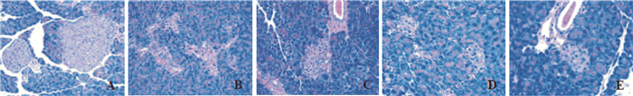 | Fig 4 Effect of RPC on morphology of pancreatic tissues in diabetic mice (HE staining×400) A. Con group; B. Mod group; C. Met group; D. RPCL group; E. RPCH group |