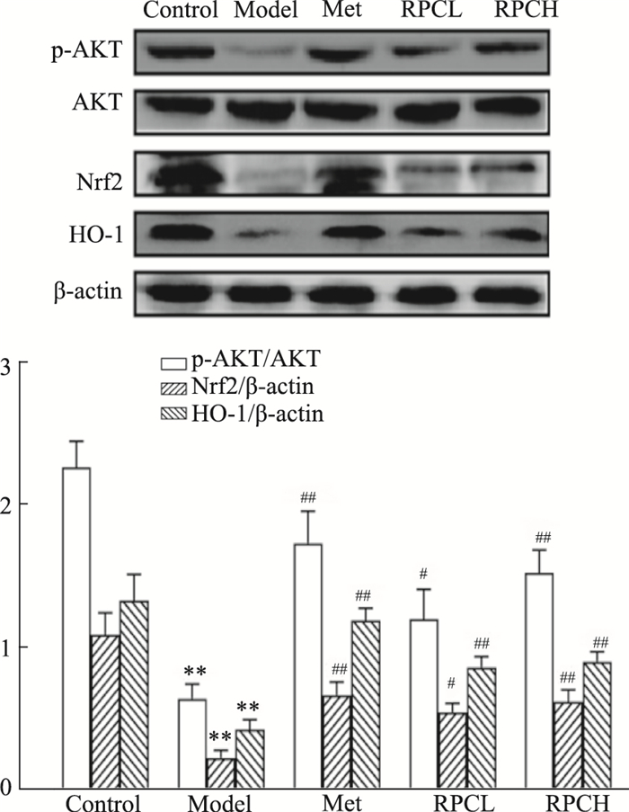 由Fig 5可知,Mod组p-AKT/AKT、Nrf2和HO-1表达比Con组明显下降(P < 0.01);Met组、RPCL组和RPCH组p-AKT/AKT、Nrf2和HO-1表达比Mod组明显增加(P < 0.05),提示RPC能激活PI3K/AKT/Nrf2信号通路。