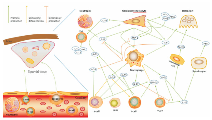 在RA中,活化的滑膜细胞会分泌趋化因子, 将T细胞、B细胞、巨噬细胞、自然杀伤细胞以及中性粒细胞募集到关节腔彼此相互“应答”。其中炎症因子是细胞之间相互“应答”的关键物质。以下炎症因子在RA中的研究中较多被提及,其中经典的RA炎症因子TNF-α、IL-6、IL-1β、粒细胞巨噬细胞集落刺激因子(granulocyte macrophage colony stimulating factor,GM-CSF)和干扰素-γ(interferon-γ,IFN-γ)以及近几年发现与RA有关的炎症因子IL-33、IL-35、IL-38、IL-37。炎症因子与RA中的各种细胞相互作用见Fig 1。