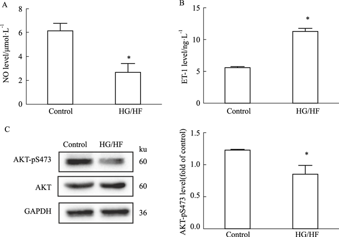 3 结果 3.1 IR模型的确立HUVECs IR指标常用培养基上清NO、ET-1水平以及Western blot法中AKT-pS473的表达水平表示,HG/HF组与control组比较,NO水平降低(P<0.05),而ET-1水平升高(P<0.05),AKT-pS473的表达水平明显降低(P<0.05),表明IR模型的成功建立(Fig 1)。
