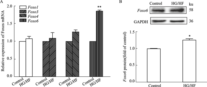 为了验证Foxos在HG/HF诱导的内皮细胞IR中是否发生了变化,采用qRT-PCR和Western blot检测其表达水平,qRT-PCR的结果显示Foxo6在HG/HF组中变化最明显,并且表达量明显升高(P<0.01),Western blot的结果表明Foxo6在HG/HF组中的表达量也是明显升高的(P<0.05)(Fig 2)。