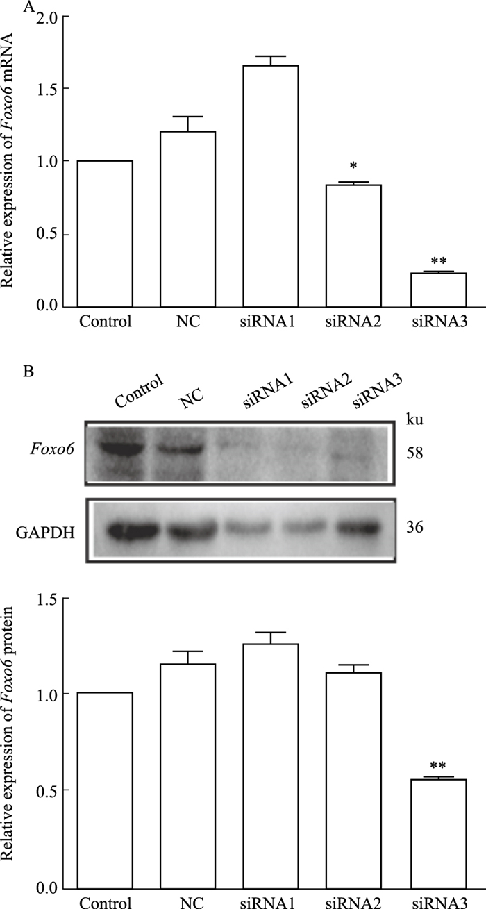 3.2中结果证明Foxo6在HG/HF组中变化最明显并且表达量升高,说明Foxo6在HG/HF应激诱导IR中可能发挥了重要作用。为了进一步阐明Foxo6与IR间究竟是一种伴随现象还是一种因果关系,通过构建Foxo6 siRNA,观察Foxo6水平下调是否能逆转HG/HF应激所诱导的IR效应。为此,针对Foxo6基因设计了3个不同靶位的siRNA序列并构建成质粒,目的是筛选出沉默效率最高的siRNA,用于后续的研究。qRT-PCR和Western blot均显示,Foxo6 siRNA3序列沉默效果最明显(P<0.05),因此选取Foxo6 siRNA3序列用来进行后续研究(Fig 3)。