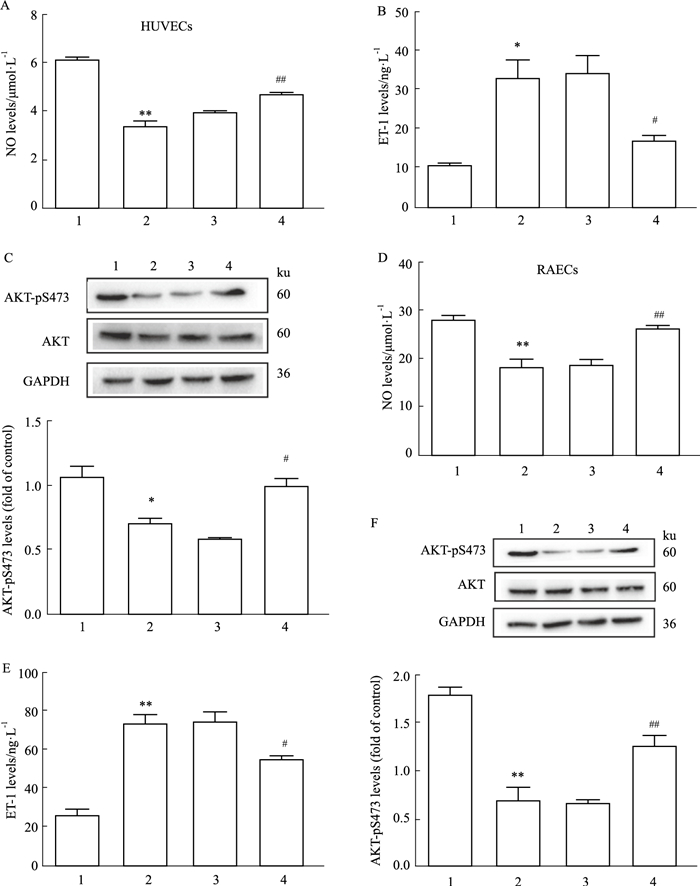 | Fig 4 NO, ET-1 and AKT-pS473 levels of various treatment in cultured HUVECs and RAECs (x±s, n=3) A: NO levels of HUVECs; B: ET-1 levels of HUVECs; C: AKT-pS473 levels of HUVECs; D: NO levels of RAECs; E: ET-1 levels of RAECs; F: AKT-pS473 levels of RAECs. 1:control; 2:HG/HF; 3:HG/HF+NC; 4:HG/HF+Foxo6 siRNA3. *P < 0.05, **P < 0.01 vs control group; #P < 0.05, ##P < 0. 01 vs HG/HF group or HG/HF+NC group. |