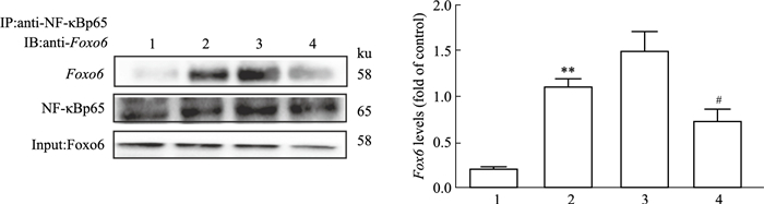 | Fig 5 Interaction between Foxo6 and NF-κBp65 of various treatment in cultured HUVECs (x±s, n=3) 1:control; 2:HG/HF; 3:HG/HF+NC; 4:HG/HF+Foxo6 siRNA3. **P < 0.01 vs control group; #P < 0. 05 vs HG/HF group or HG/HF+NC group. |