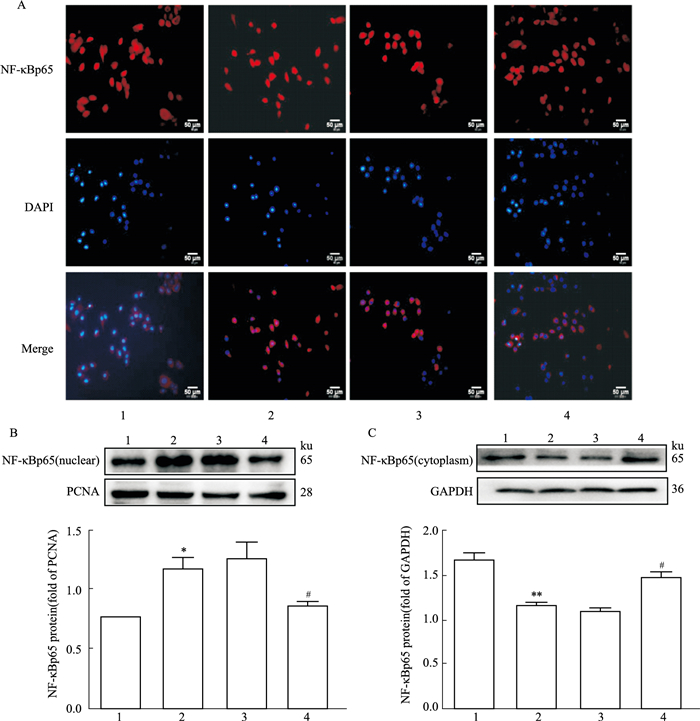2.5 免疫荧光检测NF-κBp65亚细胞定位将细胞均匀接种于24孔板中,经前期处理后,加4%多聚甲醛固定细胞,随后加入TritonX-100室温通透3 min,洗净后加入5%BSA室温封闭2 h,然后加入由5%BSA新鲜配制的NF-κBp65的一抗(比例为1:100)4 ℃孵育过夜,次日加荧光二抗(1:100)室温孵育2 h,然后DAPI染核,最后荧光显微镜下观察。