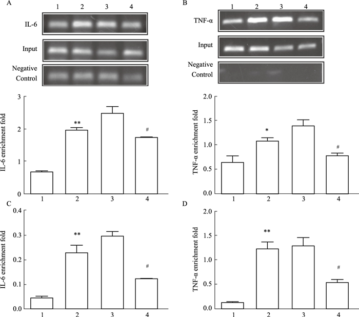 | Fig 7 Silencing Foxo6 inhibited binding activity of NF-κBp65 to its target gene promoter in various treatment in cultured HUVECs (x±s, n=3) A: and C: The enrichment rate of IL-6; B and D: The enrichment rate of TNF-α. 1:control; 2:HG/HF; 3:HG/HF+NC; 4:HG/HF+Foxo6 siRNA3. *P < 0.05, **P < 0.01 vs control group; #P < 0. 05 vs HG/HF or HG/HF+NC group. |