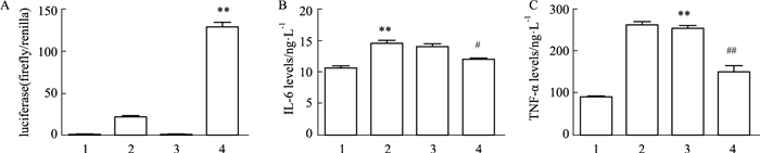2.8 ELISA法检测NF-κBp65靶基因的表达按照ELISA检测试剂盒说明书对IL-6、TNF-α进行检测,绘制标准曲线并计算各组的含量。