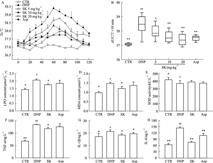 | Fig 2 Effects of shikonin on body temperature, inflammatory factors and redox levels in mice with blood heat syndrome(x±s, n=3) #P < 0.05, ##P < 0.01 vs CTR group; *P < 0.05, **P < 0.01 vs DNP group |