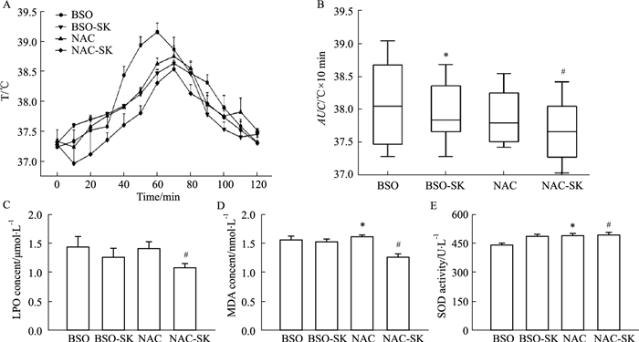 | Fig 3 Effect of redox agent on body temperature change and redox level in mice with blood heat syndrome(x±s, n=5) *P < 0.05 vs BSO group; #P < 0.05 vs NAC group. |