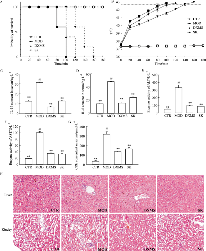 SK组明显延缓热应激小鼠的体温上升速度,明显提高热应激小鼠的生存率(Fig 5A-B)。与MOD组比较,SK组小鼠血清中TNF-α、IL-1β和IL-6的水平明显降低,脏器损伤标志物丙氨酸转氨酶(ALT)、天冬氨酸转氨酶(AST)的活力和乳酸脱氢酶(LDH)水平明显下降(Fig 4C-G)。SK组的组织水肿、炎性浸润等现象明显改善,肾小管和肾小球结构较清晰(Fig 4H)。组织病理评分显示,与CTR组相比,MOD组织损伤情况严重,SK组有明显改善(Tab 9,10)。