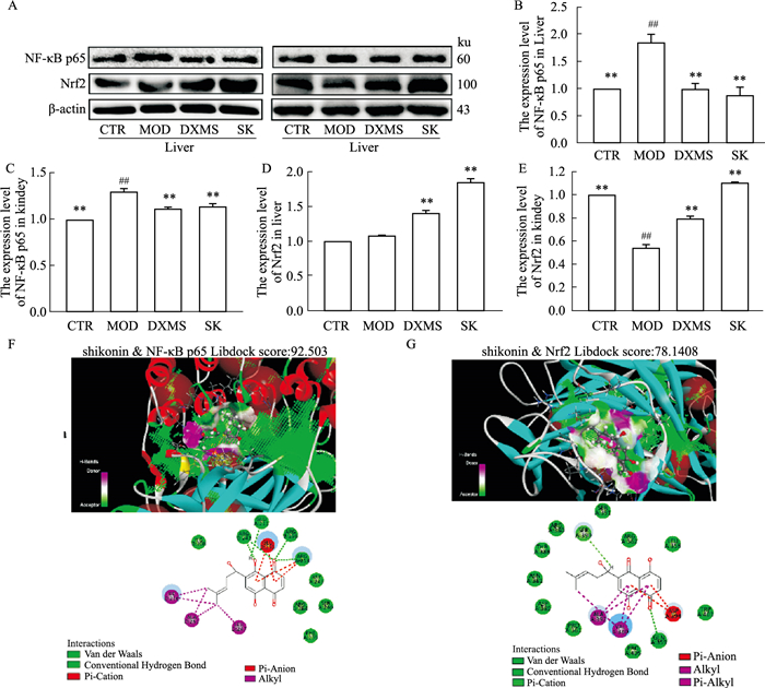 紫草素与NF-κB p65和Nrf2的晶体蛋白存在较高的结合能力,存在较好的靶标作用,结合Score为92.503和78.140 8(Fig 5F-G)。