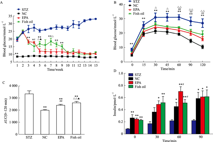 | Fig 1 ω-3 PUFAs normalized glucose metabolism in T1DM mice (x±s, n=5) A: Random blood glucose levels in STZ, NC, EPA or fish oil groups at 13 weeks of age; B: Injection glucose tolerance tests (IGTTs) in four groups at 22 weeks of age; C: AUC for IGTTs performed in four groups of mice; D: Serum insulin concentrations during the IGTT at the indicated time points. *P < 0.05, **P < 0.01 vs STZ; #P < 0.05; ##P < 0.01 vs NC; △P < 0.05, △△P < 0.01 vs NC; ▲P < 0.05 vs fish oil. |