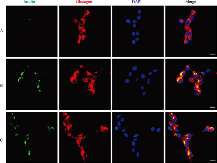 | Fig 5 Confocal images of αTC1 (insulin, green; glucagon, red; DAPI, blue) A: αTC1 cultured with EtOH (0.3 μmol·L-1) and for 48 h; B: αTC1 cultured with 17(18)-EEQ (0.3 μmol·L-1) and for 48 h; C: αTC1 cultured with 17(18)-DiHETE (0.3 μmol·L-1) and for 48 h. Scale bars: 10 μm. |