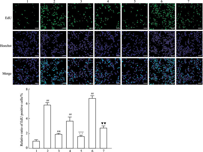Fig 2 Effect of Sal B on proliferation of HuH-7 cells (x±s, n=3) EdU assay was used to detect the proliferation of HuH-7 cells (scale bar = 100 μm). 1:Control; 2: TGF-β1;3: TGF-β1+Sal B; 4:5 μmol·L-1 XMU-MP-1;5: 5 μmol·L-1 XMU-MP-1+Sal B; 6: 10 μmol·L-1 XMU-MP-1;7: 10 μmol·L-1 XMU-MP-1+Sal B.##P < 0.01 vs the control group; **P < 0.01 vs the TGF-β1 group; ▽▽P < 0.01 vs the 5 μmol·L-1 XMU-MP-1 group; ▼▼P < 0.01 vs the 10 μmol·L-1 XMU-MP-1 group. |