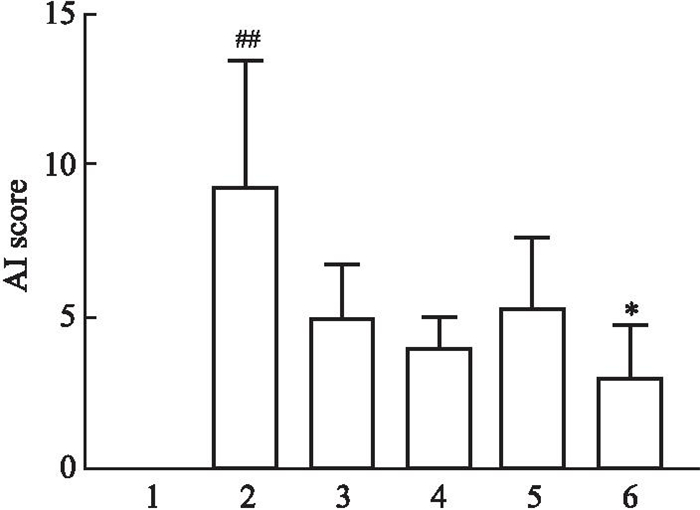 | Fig 1 Mouse paw AI score (x±s, n=4) 1: Control; 2: CIA control; 3: Triptolide; 4: DDN-low; 5: DDN-medium; 6: DDN-high.##P < 0.01 vs Control group; *P < 0.05 vs CIA model group. |