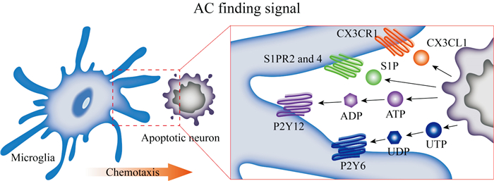 S1P是一种具有多种生物活性的溶血磷脂,能够与5种不同的G蛋白偶联受体(S1PR1-5)结合,广泛参与淋巴细胞运输、小胶质细胞活化、神经元凋亡和内皮屏障功能调节等生物过程。鞘氨醇激酶1(sphingosine kinase 1,SPHK1)和SPHK2在神经元凋亡后表达上调,使鞘磷脂磷酸化产生S1P[11]。ACs释放S1P至周围环境,通过与表达于小胶质细胞上的S1PR2和S1PR4受体结合,帮助小胶质细胞找到吞噬对象,介导AC发现信号。值得注意的是,S1P参与调控小胶质细胞胞葬作用,除了介导AC发现信号外,还作为小胶质细胞表面的髓系细胞触发受体2(triggering receptor expressed on myeloid cells-2,Trem2)的内源性配体,介导AC结合信号,促进小胶质细胞吞噬凋亡神经元[12]。