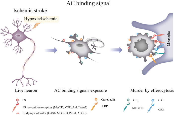 除了PS介导AC结合信号外,钙网蛋白和补体1q(complement 1q,C1q)、补体3b(complement 1q,C3b)也参与小胶质细胞识别凋亡神经元的过程[19]。当神经元受到缺血应激并发生凋亡时,钙网蛋白会从内质网易位到细胞表面,结合小胶质细胞上的低密度脂蛋白受体相关蛋白(low-density lipoprotein receptor-related protein,LRP),随后被胞葬作用清除。补体成分C3在转化酶的作用下能够生成C3a和C3b,C3b及其受体CR3介导ACs的清除。C1q能够与ACs表面去唾液酸糖蛋白结合,经小胶质细胞的表皮生长因子样蛋白10(multiple epidermal growth factor like domains 10,MEGF-10)受体形成AC结合信号,促进胞葬作用。此外,C1q还能作为ACs膜调理素,细胞膜经C1q调理后,钙网蛋白更易结合于ACs表面,促进钙网蛋白-LRP依赖的胞葬作用。