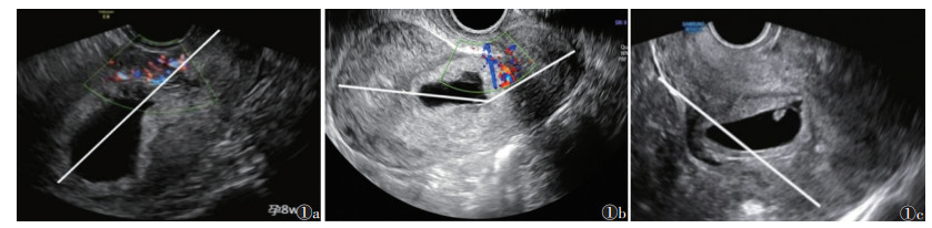 | 注:图1a患者,女,32岁,孕7周2 d,妊娠囊最大部分向宫腔突出,为A型;图1b患者,女,30岁,孕6周5 d,妊娠囊最大部分嵌入子宫肌层,位于子宫内膜宫腔线和浆膜线之间,为B型;图1c患者,女,34岁,孕7周1 d,妊娠囊部分位于子宫轮廓之外,为C型 图 1 根据Delphi共识对剖宫产瘢痕妊娠(CSP)分型 |