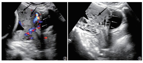 | 注:图2患者,女,33岁,经腹超声检查示胎盘发生植入,胎盘实质内可见大小不等无回声区(黑箭),胎盘后方子宫肌层消失,子宫-膀胱交界面异常血管,子宫浆膜- 膀胱线连续性中断(白箭)。图3患者,女,32岁,经腹超声检查示孕晚期胎盘发生植入,胎盘实质内可见大小不等无回声区,胎盘内血窦形成(黑箭),胎盘后方透明带消② ③失,子宫浆膜-膀胱线连续性中断(白箭) 图 2-3 剖宫产瘢痕处妊娠(CSP)患者超声图像 |