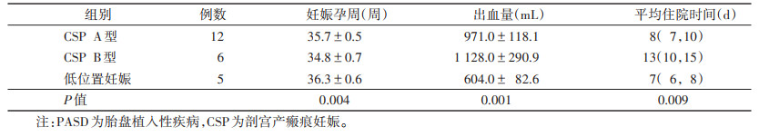 207例中,继续妊娠至生产50例(24.2%),根据最新Delphi共识分析,50例中CSP 18例(36.0%),其中A型12例(24.0%),B型6例(12.0%),C型0例;低位置妊娠32例(64.0%)。50例中,23例发生PASD,其中CSP A、B型18例,低位置妊娠5例。23例PASD中,CSP A、B型及低位置妊娠3组孕周、出血量、住院时间差异均有统计学意义(均P<0.05)(表 1)。32例低位置妊娠患者妊娠囊周边丛密绒毛膜植入位置:前壁14例,后壁18例。植入后壁者均未发生PASD,植入前壁者中5例(35.7%)发生PASD。
