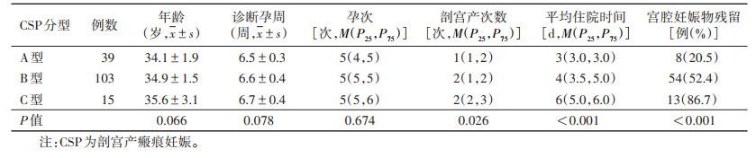 207例中终止妊娠157例,根据新的Delphi共识仍被诊断为CSP,其中A型39例(24.8%),B型103例(65.6%),C型15例(9.6%),与术后病理结果一致。157例中CSP A、B、C型3种分型之间平均住院时间、剖宫产次数、宫腔妊娠物残留情况差异均有统计学意义(均P<0.05),CSP C型术后宫腔妊娠物残留率达86.7%。3种分型患者的年龄、诊断孕周及孕次比较差异均无统计学意义(均P > 0.05)(表 2)。