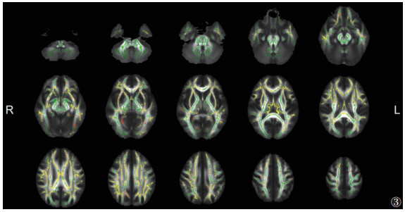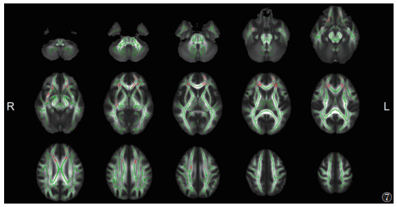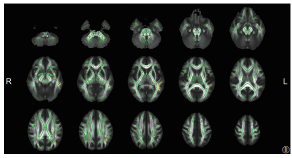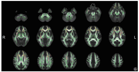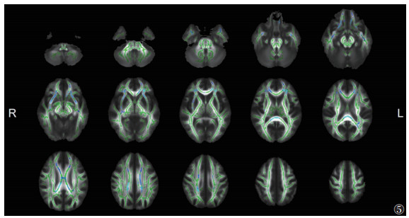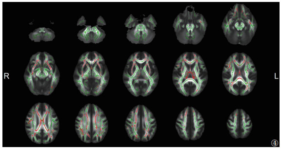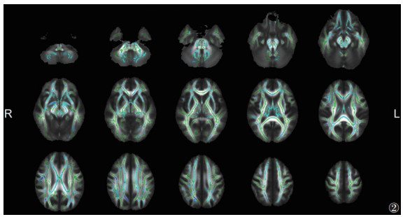 1.6 数据处理排除伪影严重的图像后,将数据进行格式转换,应用脑功能MRI软件库FSL 4.1.0版(http://www.fmrib.ox.ac.uk/fsl)处理分析DTI数据:①提取FA和MD。②TBSS分析。将每位受试者的FA图像非线性配准至蒙特利尔神经病学研究所(Montreal Neurological Institute,MNI)152空间中的FMRIB58_FA模板,进行平均并细化,生成平均FA骨架图像(FA阈值>0.2),将对齐后的FA数据投影至平均FA骨架上,最后将MD数据投影至平均FA骨架上。③提取骨架值。参考FSL提供的JHU-ICBM-DTI-81白质图谱,根据不同白质纤维束划分脑区,并提取各脑区的平均FA和MD用于统计分析。