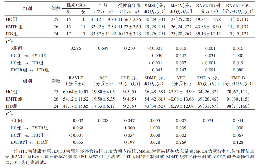 颅内结核(intracranial tuberculosis,ITB)是由结核分枝杆菌(mycobacterium tuberculosis,MTB)引起的最严重的肺外结核[1],临床表现多样且不典型,早期难以明确诊断[2]。根据常规MRI检查结果,可将结核患者分为有颅内表现和无颅内表现。ITB通常继发于存在播散的颅外结核病灶,在结核播散的情况下,患者更可能发展为多器官结核。与单一器官结核患者相比,颅外多器官结核(extracranial multi-organ tuberculosis,EMTB)患者并发ITB的风险显著增高。研究发现,EMTB患者可在颅内未有明确结核病灶前,脑内功能活动即发生改变,这可能与潜在的脑内微结构异常有关[3]。目前尚缺乏探索ITB、EMTB与健康对照(health control,HC)之间脑内结构的研究。DTI通过检测生物组织内水分子的扩散速率生成图像,能清晰显示白质纤维的走向及其结构[4]。各向异性分数(fractional anisotropy,FA)和平均扩散系数(mean diffusivity,MD)是DTI的2个重要指标。基于纤维束示踪的空间统计(tract-based spatial statistics,TBSS)通过提供更可靠的白质束对齐方式,提高了可靠性和精度[5-6]。本研究拟采用TBSS,比较ITB患者与HC、EMTB患者间脑白质微结构的差异,探讨常规MRI检查中不同颅内表现结核患者脑白质的改变,并进一步分析其与认知功能的关系。