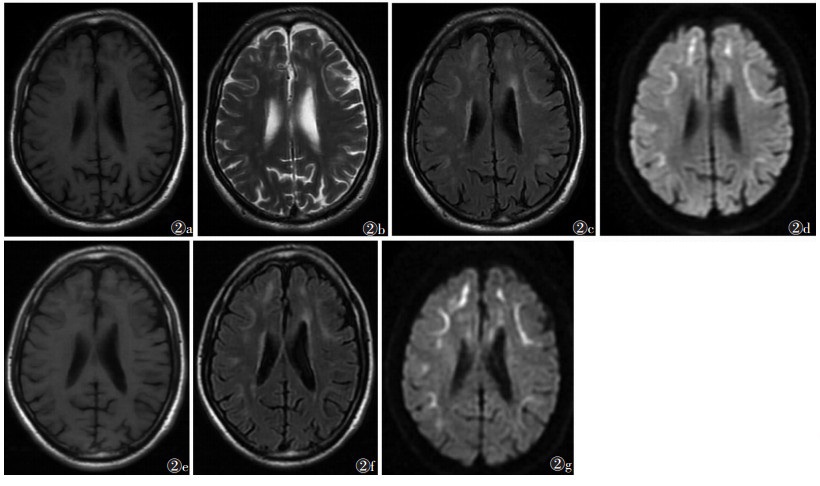 图 2 女,45岁,头晕、头痛3个月 图 2a T1WI示病灶呈低信号 图 2b T2WI示双侧额顶叶脑皮髓质交界处可见U形高信号 图 2c T2 FLAIR示病灶呈高信号 图 2d DWI可见病灶呈明显U形高信号 图 2~2g 分别为6个月后复查T1WI、T2 FLAIR、DWI图像,提示病变变化不明显 |