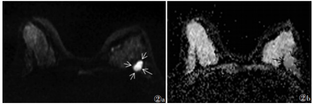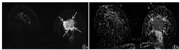| 注:患者,女,68岁,病理结果为浸润性大汗腺乳腺癌,WHO Ⅱ级。图 1a为轴位DWI,示左乳腺中份肿块(白箭),呈高信号;图 1b为轴位ADC图,示左乳腺肿块呈低信号(白箭),ADC值为1.001×10-3 mm2/s 图 1 乳腺癌MRI图像 |