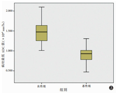 | 注:女性乳腺良恶性病变的ADC值有差异,同时存在少量重叠 图 3 女性乳腺良恶性病变ADC值箱式图 |