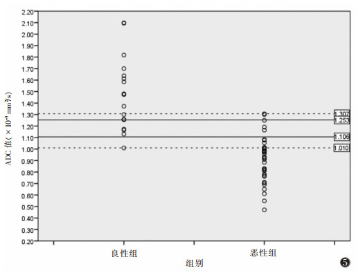 2组ADC值散点图见图 5,18例良性病变ADC值均 > 1.000×10-3 mm2/s;良恶性病变的ADC值在(1.010~1.307)×10-3 mm2/s之间存在重叠;以1.106×10-3 mm2/s为阈值,个别良性病变误诊为乳腺癌,少量乳腺癌漏诊;以1.253×10-3 mm2/s为阈值,个别乳腺癌漏诊,少量良性病变误诊为乳腺癌。