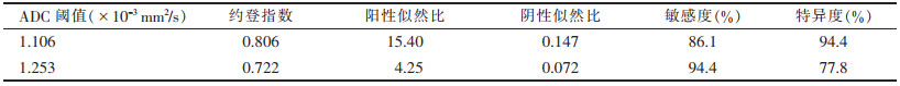 本研究约登指数为0.722时,所对应的ADC值为1.253×10-3 mm2/s,敏感度94.4%(高),特异度77.8%(不够高),阳性似然比4.25(<10),阴性似然比0.072(<0.1)。其优点是阴性似然比足够低(0.072),大于此阈值排除乳腺癌可能具有显著性,敏感度足够高(94.4%),乳腺癌漏诊可能性很小。其缺点是阳性似然比不够高(4.25),正确诊断乳腺癌比例不具有显著性,特异度77.8%提示将乳腺良性病变误诊为恶性病变比例较高,可能增加一定比例的穿刺活检或手术病例。