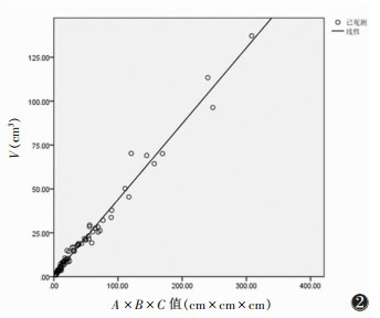 通过SPSS 21.0统计学软件先绘制出2组变量(A×B×C值、体积)散点图,再求出相关系数r值,检验其相关性,以P<0.005为差异有统计学意义;最后通过线性回归方程Y=a+bX得出常数项a和回归系数b值。计量资料若服从正态分布配对资料采用配对样本t检验,若不服从正态分布,采用秩和检验。