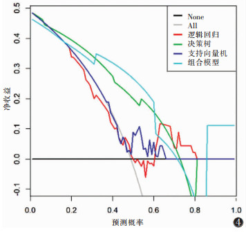 训练集及测试集中逻辑回归和支持向量机模型对非特殊类型浸润性乳腺癌组织学分级的分类性能差异均无统计学意义(均P > 0.05);决策树模型的分类性能均显著高于逻辑回归模型和支持向量机模型(均P<0.05);组合模型的分类性能与单纯的决策树模型比较,差异均无统计学意义(均P >0.05)。决策树、组合模型的临床应用价值优于逻辑回归和支持向量机(均P<0.05)。