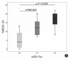 | 图 3 出院后3个月Rankin量表评分(mRS-3m)与NIHSS-24的相关性 |