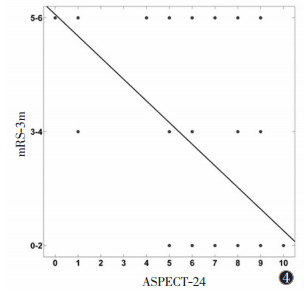 | 图 4 mRS-3m与血管内治疗后24 h的阿尔伯塔脑卒中早期CT评分(ASPECTS-24)的相关性 |