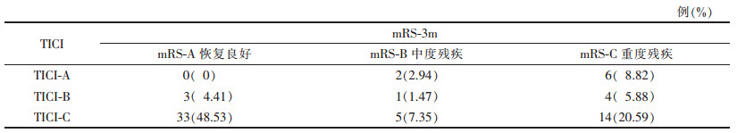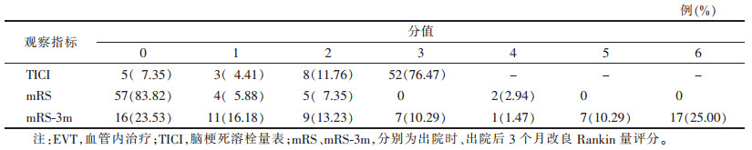 EVT治疗24 h后,NIHSS-24平均(11.00±6.96)分(0~23分),CCS平均(3.00±1.13)分(0~4分),OTID平均(300.00±11.06)min(140~720 min);TICI和mRS-3m评分见表 1。并发症:栓塞8例(11.76%),蛛网膜下腔出血2例(2.94%)。