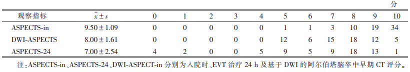 | 表 3 入院时DWI-ASPECTS、ASPECT评分及EVT后24 h ASPECTS评分情况 |