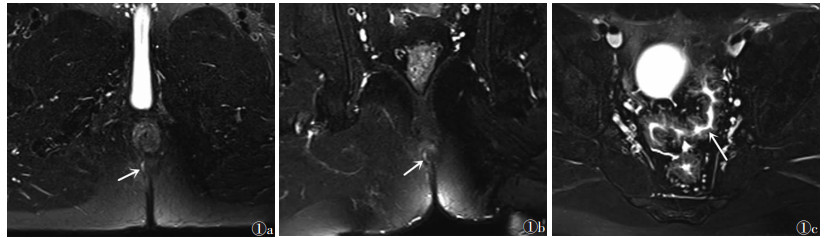 | 图 1 男,25岁,单纯括约肌间线性瘘管(Ⅰ级) 图 1a,1b 轴位及冠状位脂肪抑制T2WI显示瘘管位于内外括约肌间(箭头) 图 1c 轴位脂肪抑制T2WI显示乙状结肠壁增厚(箭头),提示炎性肠病 |