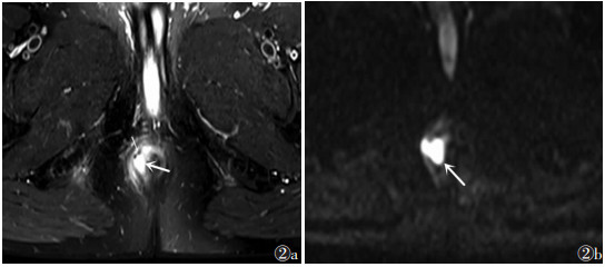 | 图 2 男,31岁,括约肌间复杂瘘管(Ⅱ级) 图 2a 轴位脂肪抑制T2WI显示内外括约肌间脓肿(粗箭)、内见点状气体信号影(细箭) 图 2b b值=1 000 s/mm2的DWI显示脓肿呈高信号 |
