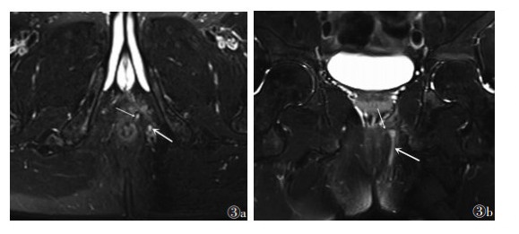 | 图 3 男,43岁,单纯经括约肌瘘管(Ⅲ级) 图 3a 轴位脂肪抑制T2WI显示瘘管内口(细箭)、瘘管位于外括约肌的外侧(粗箭) 图 3b 冠状位脂肪抑制T2WI显示瘘管经内外括约肌(细箭)走行于外括约肌的外侧(粗箭) |