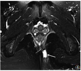 | 图 4 男,37岁,经括约肌的复杂瘘管(Ⅳ级),轴位脂肪抑制序列T2WI显示坐骨直肠脂肪间隙脓肿(粗箭)及经内外括约肌的瘘管(细箭) |