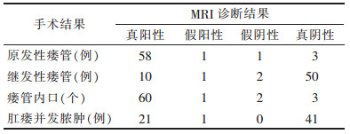 1.3 图像分析MRI图像由2名MRI诊断医师(具有5年以上MRI工作经验)独立进行盲法分析,包括原发性及继发性瘘管的数量、走行、内口位置及是否伴脓肿。瘘管定义为条状或椭圆形长T1、长T2信号影;原发性瘘管是指连接于肛周或直肠至肛门周围皮肤的异常通道;继发性瘘管是指与原发性瘘管相连、直径小于原发性瘘管、可有独立内口的细小分支。肛周脓肿定义为盆底或括约肌间脂肪间隙内在DWI上呈圆形或类圆形异常聚集的高信号、ADC呈低信号;瘘管内口按肛管时钟表方向进行定位。瘘管的分级采用St. James大学医院分级系统[5]:Ⅰ级,单纯括约肌间线性瘘管;Ⅱ级,括约肌间复杂瘘管;Ⅲ级,单纯经括约肌瘘管;Ⅳ级,经括约肌的复杂瘘管;Ⅴ级,肛提肌上和经肛提肌瘘管及括约肌外瘘管。