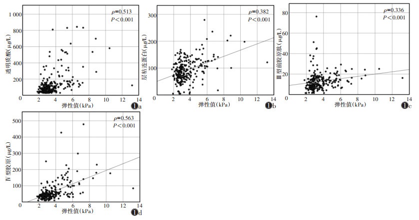 | 注:图 1a~1d分别为透明质酸、层粘连蛋白、Ⅲ型前胶原肽、Ⅳ型胶原分布的散点图 图 1 不同磁共振弹性成像(MRE)弹性值时肝纤维化血清学指标分布的散点图 |